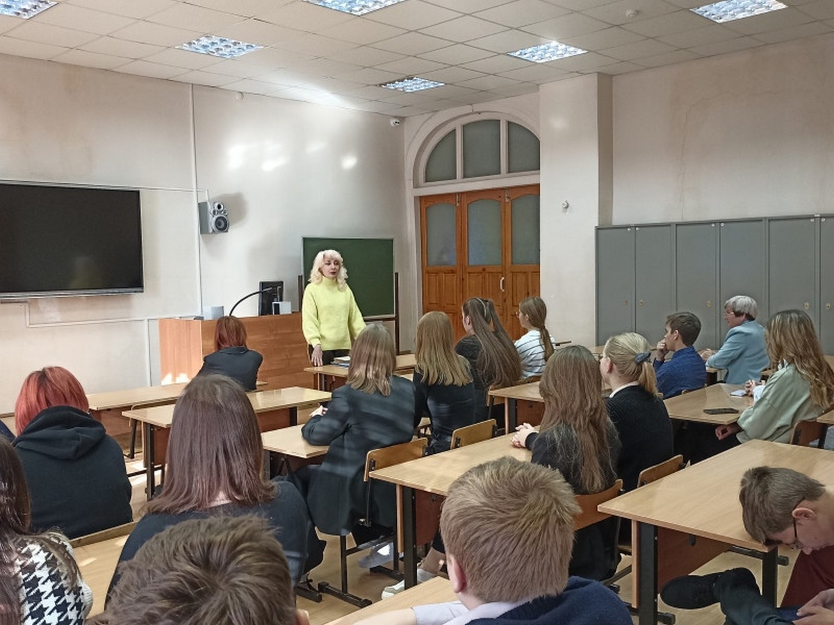 Наталья Черникова рассказала ученикам 9-11 классов о работе и истории органов ЗАГС, показала архивные книги 1927 года и современного периода, поздравления губернатора с рождением ребенка, памятные знаки «Родившемуся на Рязанской земле».