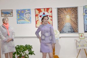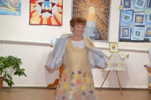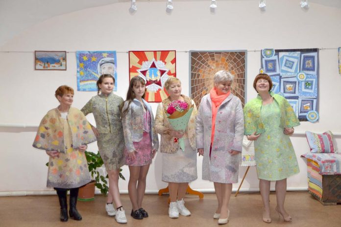 Любимая техника мастерицы в лоскутном шитье – это техника «пицца». Именно в ней созданы многие панно и модели одежды. Началась выставка с демонстрации различных женских моделей одежды, в дефиле участвовали сапожанки.