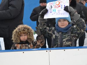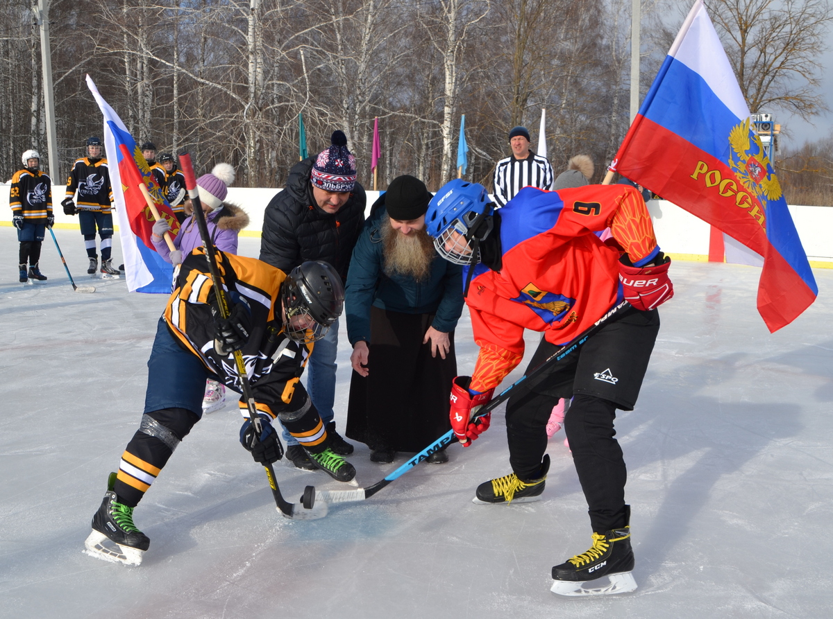 Началась игра с символического вбрасывания шайбы. В нем поучаствовали глава районной администрации Алексей Кириллов и настоятель Троицкого храма в селе Красное иерей Георгий Дрокин.
