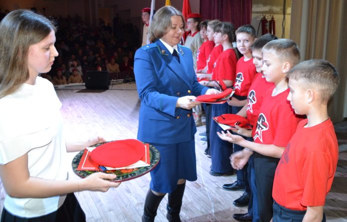 Исполняющий обязанности прокурора района Елена Бурмистрова и начальник сапожковского пункта полиции Вячеслав Барсуков поздравили школьников со вступлением в отряд «Сапожковские Ястребы» и вручили новобранцам юнармейские береты и нагрудные знаки.